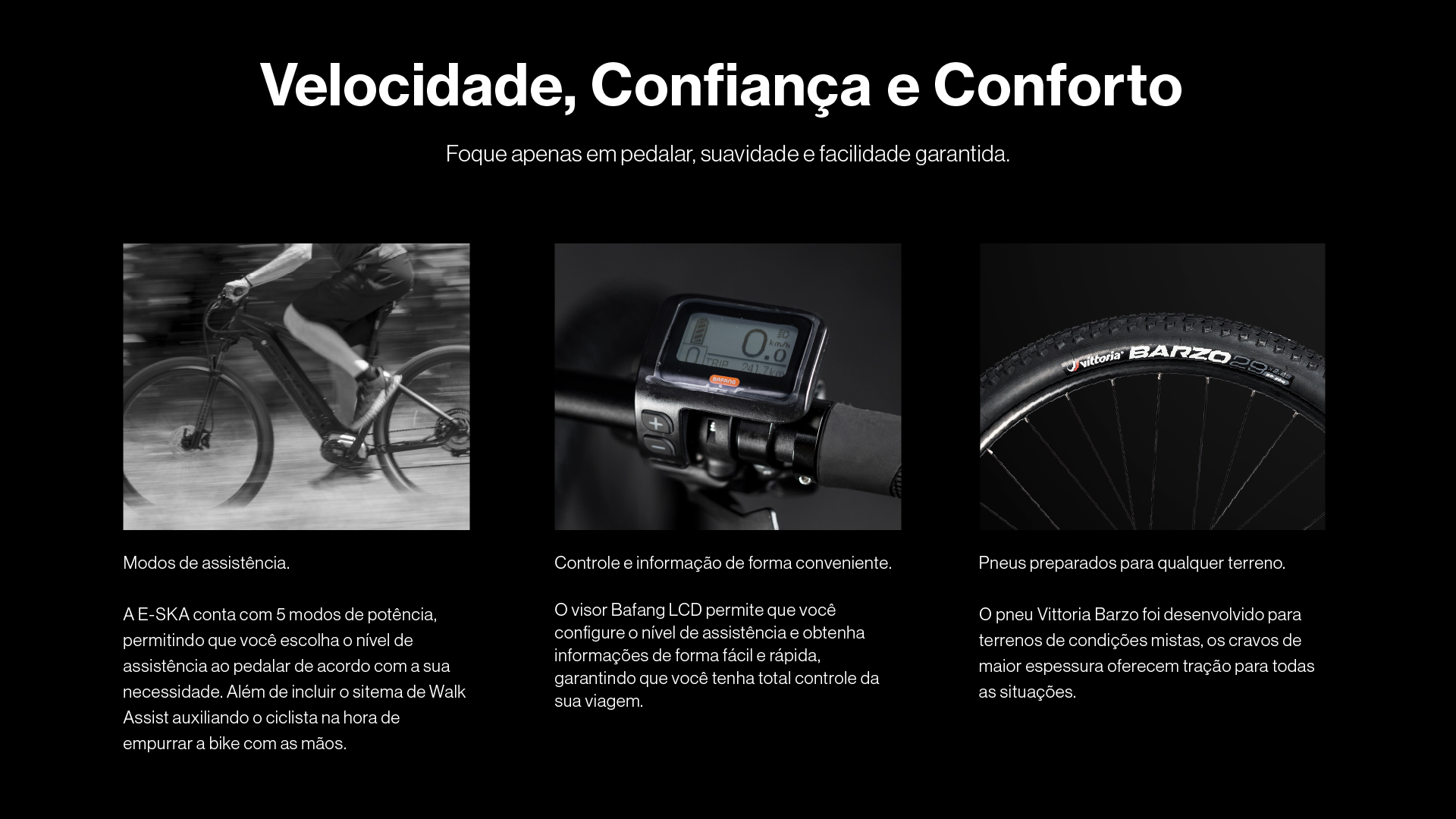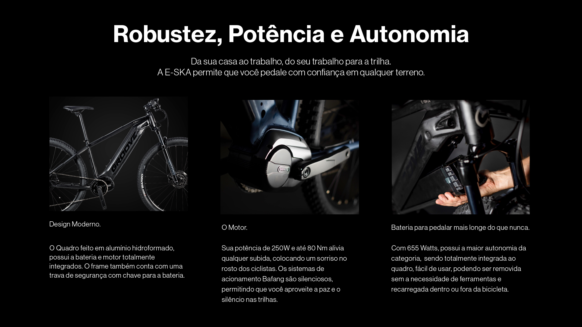 A versatilidade para pedalar onde você quiser, independente do terreno. O motor Bafang M410, aliado com a bateria de 655 Wh, transformam a E-SKA em uma excelente opção para se pedalar tanto nas trilhas quanto na cidade.