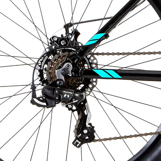 Conjunto de transmissão 100% Shimano, câmbio traseiro XT de 12 velocidades com a mesma qualidade e resistência de grupos superiores da Shimano. Cassete Shimano SLX e corrente Deore. O pedivela Shimano é de acordo com o tamanho do quadro, para melhor adaptação do ciclista sob a bike.